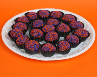 Brigadeiro envolto com miçangas laranjas e roxas. |