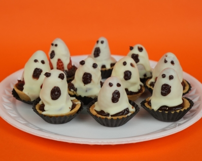 Tortinha de morango, tendo base de massa amanteigada, recheio de brigadeiro branco, morango, e cobertura de chocolate branco tipo fantasminha. |