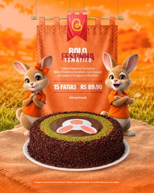 Bolo de chocolate recheado com brigadeiro trufado e coberto com calda de chocolate e granulados, com decoração de Páscoa. Rendendo 15 fatias (peso médio 1,600 kg). |