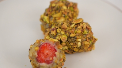 Morango inteiro envolto no brigadeiro brigadeiro de Pistache.