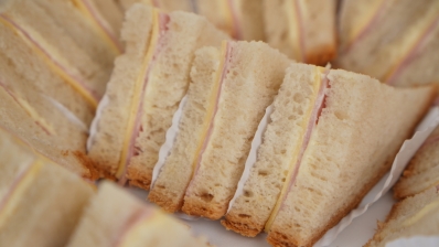 Pão artesanal de sanduíche recheado com maionese, presunto, queijo prato.