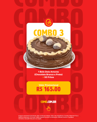 Especificações do produto: 01 Bolo Dois Amores 15 fatias. Descrição: Duas massas de chocolate e uma massa branca, uma camada de brigadeiro trufado preto, uma camada de brigadeiro branco, cobertura de ganache e decorado com docinhos. Peso aproximado: 2,5 kilos. Tamanho: 21 cm de diâmetro. Altura: aproximadamente 8 a 10 cm. 50 salgadinhos, sabores: coxinha, risoles de frios e salsicha empanada. Valores válidos enquanto durarem os estoques, podendo ser alterados sem aviso prévio. |