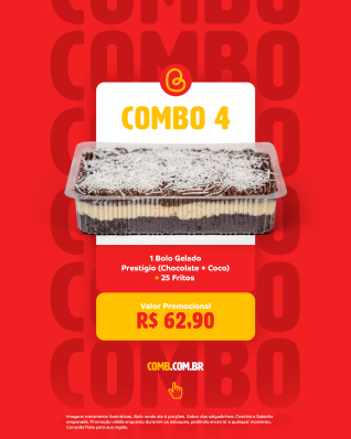 01 bolo gelado de prestigio com rendimento de 6 porções + 25 salgadinhos (coxinha e salsicha empanada) Descrição do bolo gelado: massa de chocolate, recheio de prestigio, cobertura de chocolate e coco fresco. Valores válidos enquanto durarem os estoques, podendo ser alterados sem aviso prévio.