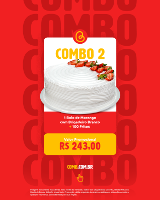 01 Bolo de Morango. (Pão de Ló branco recheado com duas camadas de brigadeiro branco com morangos picados. Cobertura de chantilly, finalizado com morangos.) Peso aproximado: 2 kilos. Tamanho: 21 cm de diâmetro. Altura: aproximadamente 8 a 10 cm. 100 salgadinhos, sabores: coxinha, risoles de frios, salsicha empanada e risoles de carne.